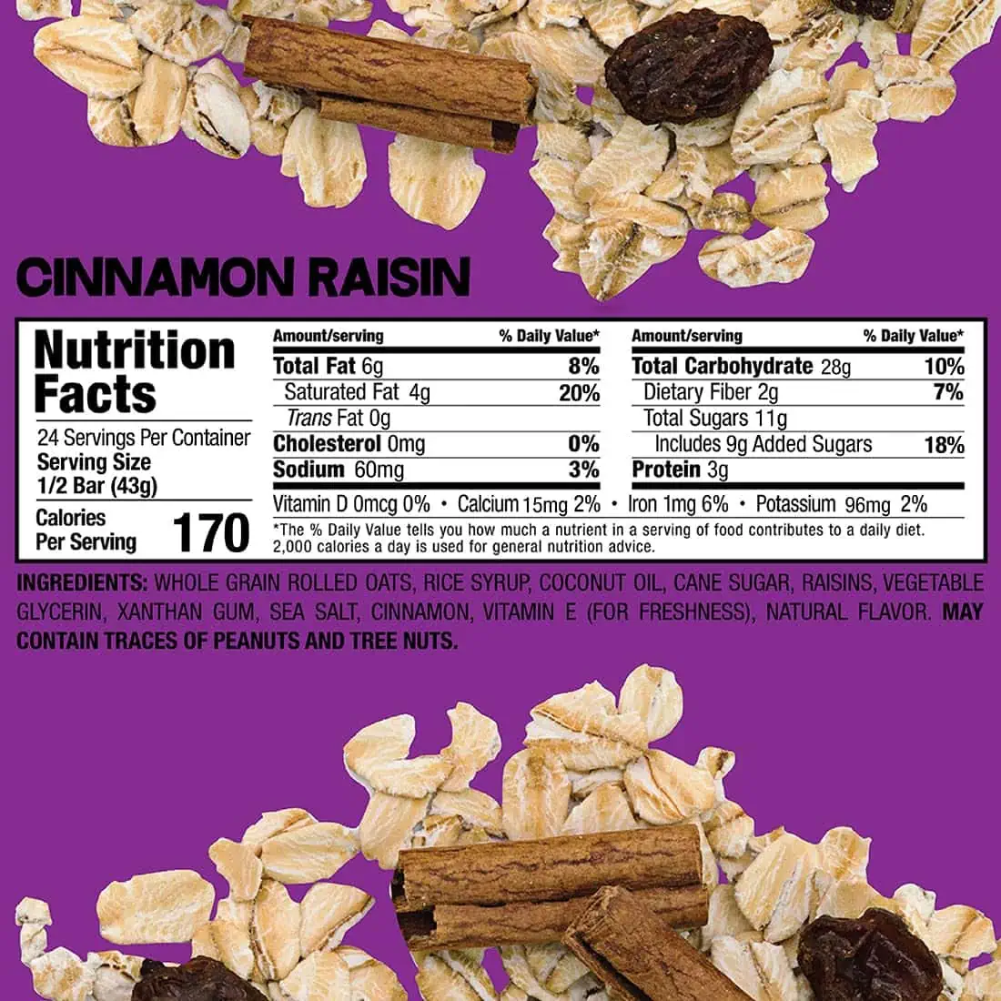 - Our Cinnamon Raisin oat bar has gained many loyalists over the years. Its followers swear by the bar as their only favorite – and for good reason. Its sweet cinnamon smell takes you back to your childhood kitchen, but the hearty oats and sweet raisins power you throughout your day. This bar is great for that mid-afternoon snack.