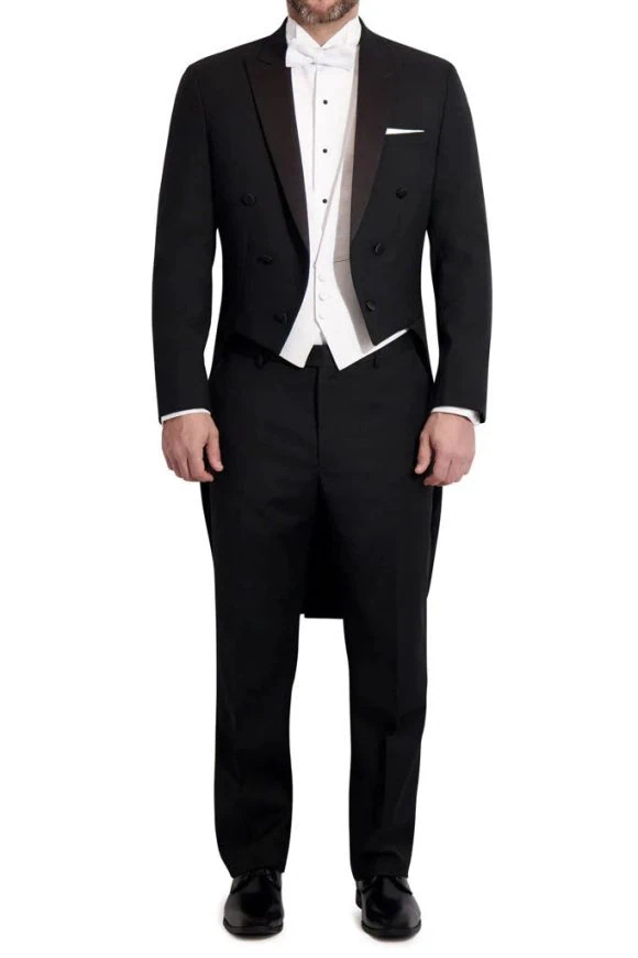 Meet “Edward,” a black tuxedo tailcoat built for the most formal dress codes. Satin peak lapels, a clean one-button front, and a cutaway silhouette with sculpted tails deliver classic evening lines. A smooth lining and lightly structured shoulders layer comfortably over a waistcoat and dress shirt, keeping movement easy and the profile sharp. Finished with covered buttons and precise seaming, it pairs best with tuxedo trousers, a wing-collar shirt, studs, and a bow tie for white-tie or ultra-formal black-tie events. Ideal for grooms, gala guests, and concert attire, this piece reads polished in photos and in motion. Choose your usual tux size for a tailored look or size up if you plan on heavier layering or alterations. Timeless, refined, and ceremony-ready, Edward is the tailcoat you’ll rely on whenever the invitation calls for impeccable form.