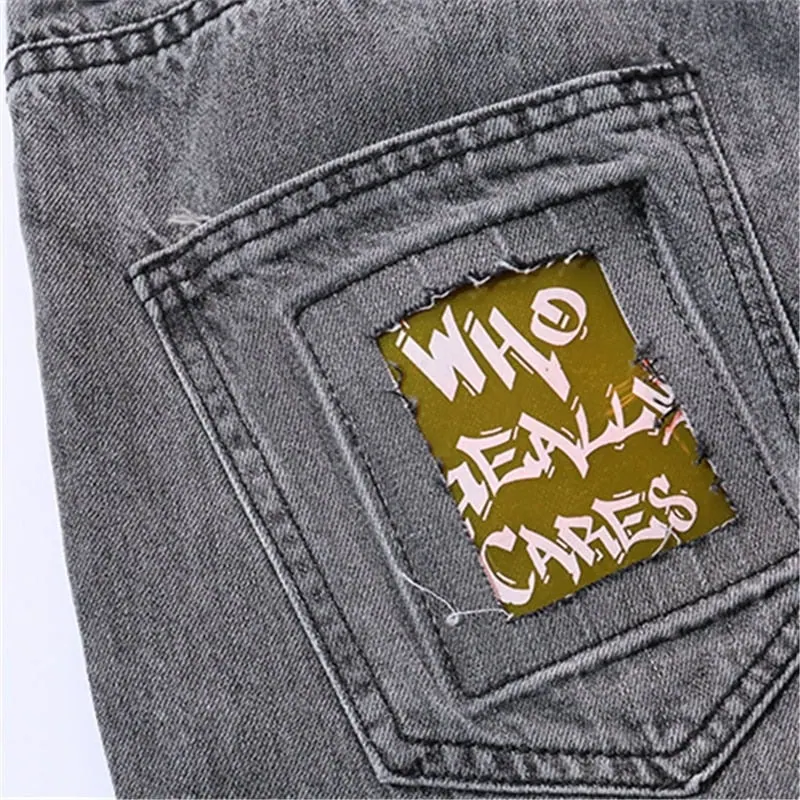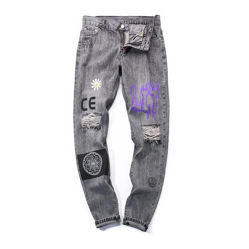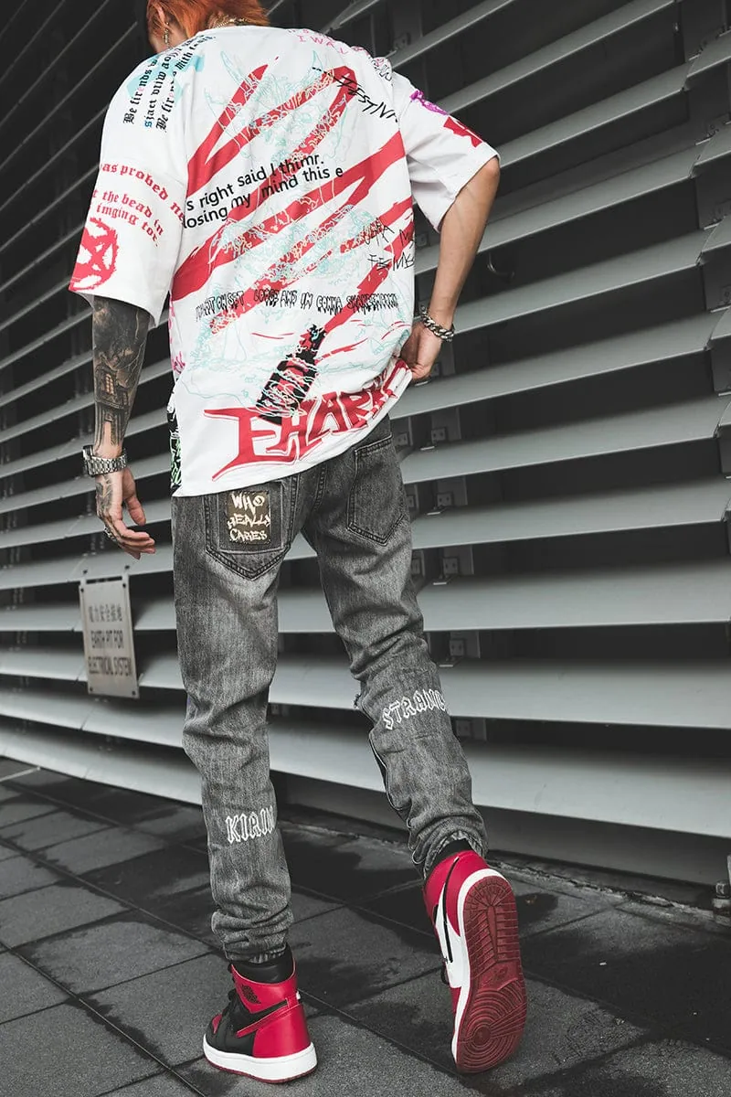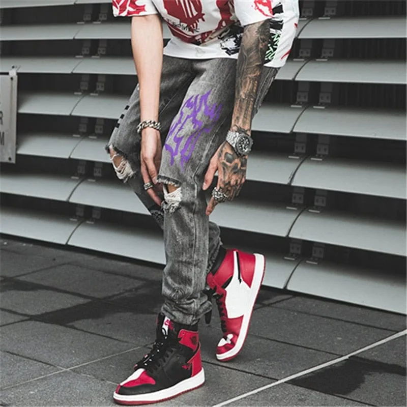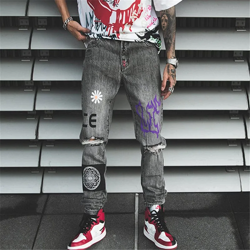 Hip Hop Men Jogger Denim Pants Skinny Washed Distressed Jeans Graffiti Print Streetwear Destroyed Ripped Jeans
